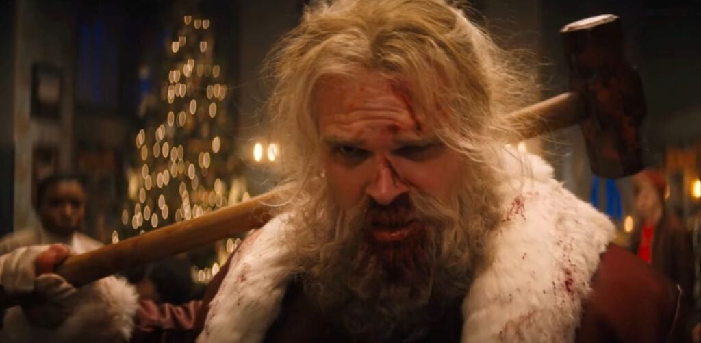 No filme Noite Infeliz, David Harbour faz um Papai Noel que encontra uma família refém de mercenários e é forçado a resolver o assunto com as próprias mãos.